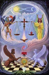 L’axe central, structuré par la Balance, renvoie à la Maât, loi d’harmonie, de vérité et de justesse cosmique. Il ne s’agit pas d’un jugement moral, mais d’une mise en équilibre des forces intérieures de l’être. Le feu qui s’élève depuis la main ouverte symbolise l’étincelle divine révélée par l’initiation, principe de transmutation et de renaissance spirituelle.
