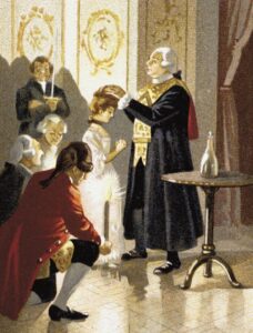 Issu d’un milieu très modeste, Cagliostro parcourt l’Europe de cour en cour, de Paris à Strasbourg, de Londres à Rome. Il se fait connaître comme guérisseur, soignant gratuitement les pauvres, distribuant remèdes et élixirs, promettant parfois des guérisons spectaculaires. Cette dimension charitable contribue à sa popularité.